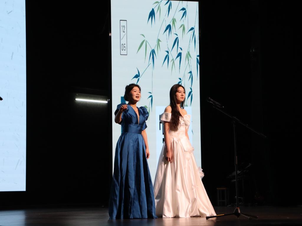 原昭琪、王怡卓两位同学带来的女声二重唱《竹枝词》,以默契的配合和细腻、抒情的嗓音展现了一幅富有生活气息的山水风俗和爱情画面。