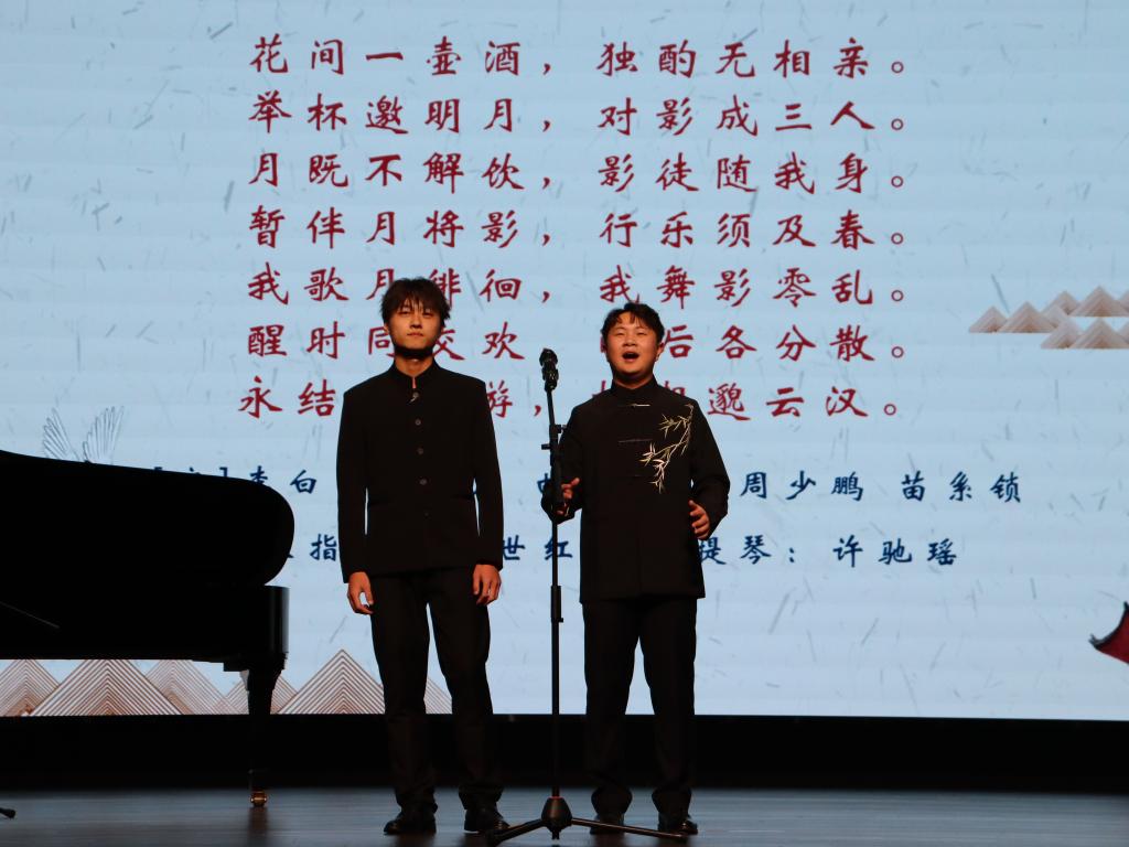 周少鹏、苗系锁两位同学带来的男声二重唱《月下独酌》,以细腻的嗓音,配以钢琴、小提琴优美的声音,让人仿佛置身其中,感受到诗仙李白孤独惆怅的情感。