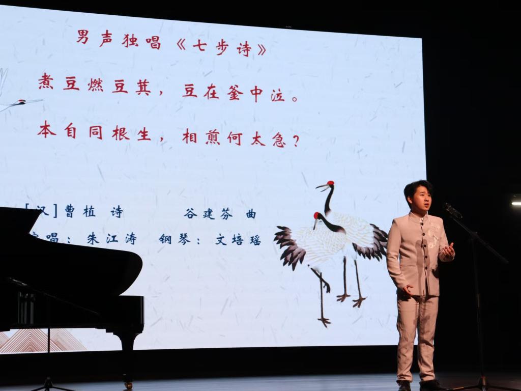 朱江涛带来的男声中音独唱《七步诗》,表现了兄弟相残的悲哀以及手足之情的珍贵,醇厚的嗓音和表演生动刻画了悲凉的情感。