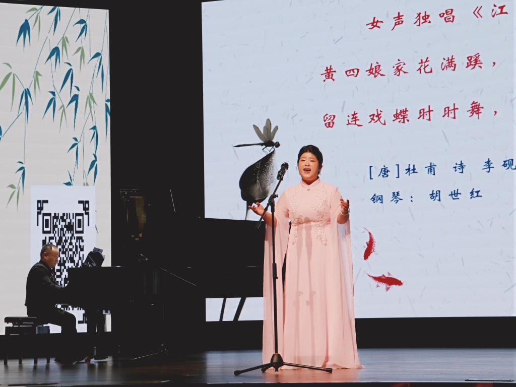 吴梦带来的女高音独唱《江畔独步寻花》,其甜美、灵动的嗓音,与钢琴、古筝的伴奏和谐交融,立体展示了黄四娘的人物形象。