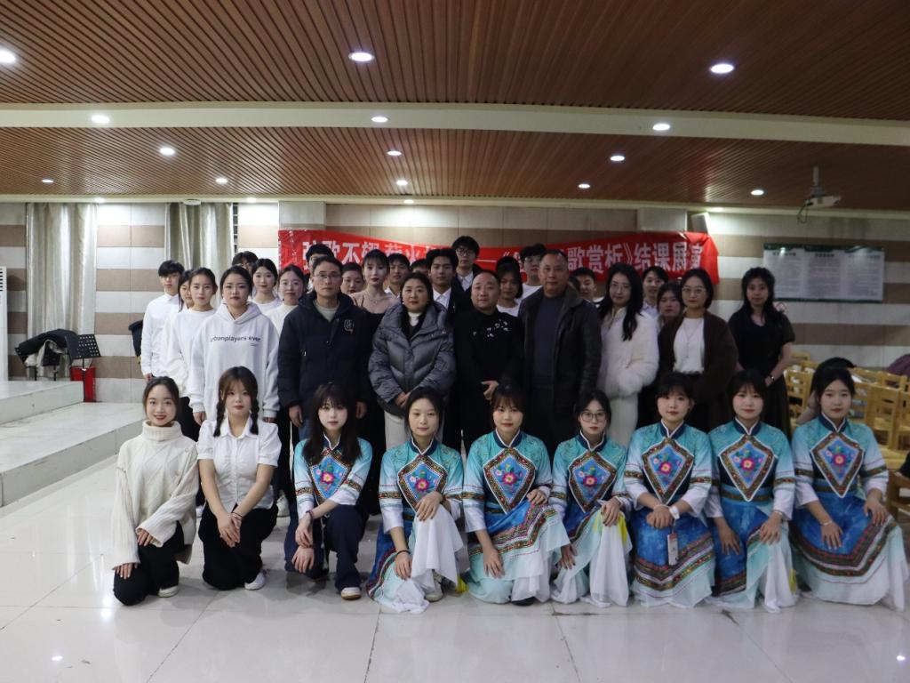 为进一步深化美育浸润活动育人实效,推进音乐理论专业教学与美育浸润太阳集团融合,近日,太阳集团tyc138联合公共艺术教学部在艺术楼201举办了“传承优秀文化 美育浸润心灵”《信阳民歌赏析》结课展演暨美育浸润育人成果展示音乐会。信阳市文化馆戏曲部主任杨四营、公共艺术教研室主任朱永昌、ok138cn太阳集团钢琴与器乐教研室主任胡世红、音乐理论教研室青年教师代表郑亚楠、李皖晴和近200名学生共同观看了本次演出。来自2022级音乐学和音乐表演各班级的100余名同学参加了本次演出。