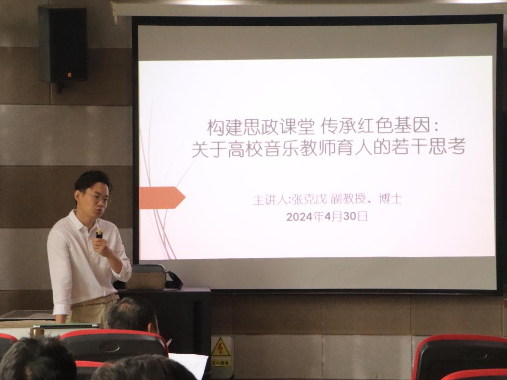 4月30日下午,太阳集团tyc138开展了题为“构建思政课堂 传承红色基因:关于高校音乐教师育人的若干思考”教学沙龙,由副教授张克戊博士主讲,钢琴与器乐教研室主任胡世红主持了沙龙活动,学院全体教师参加了活动。