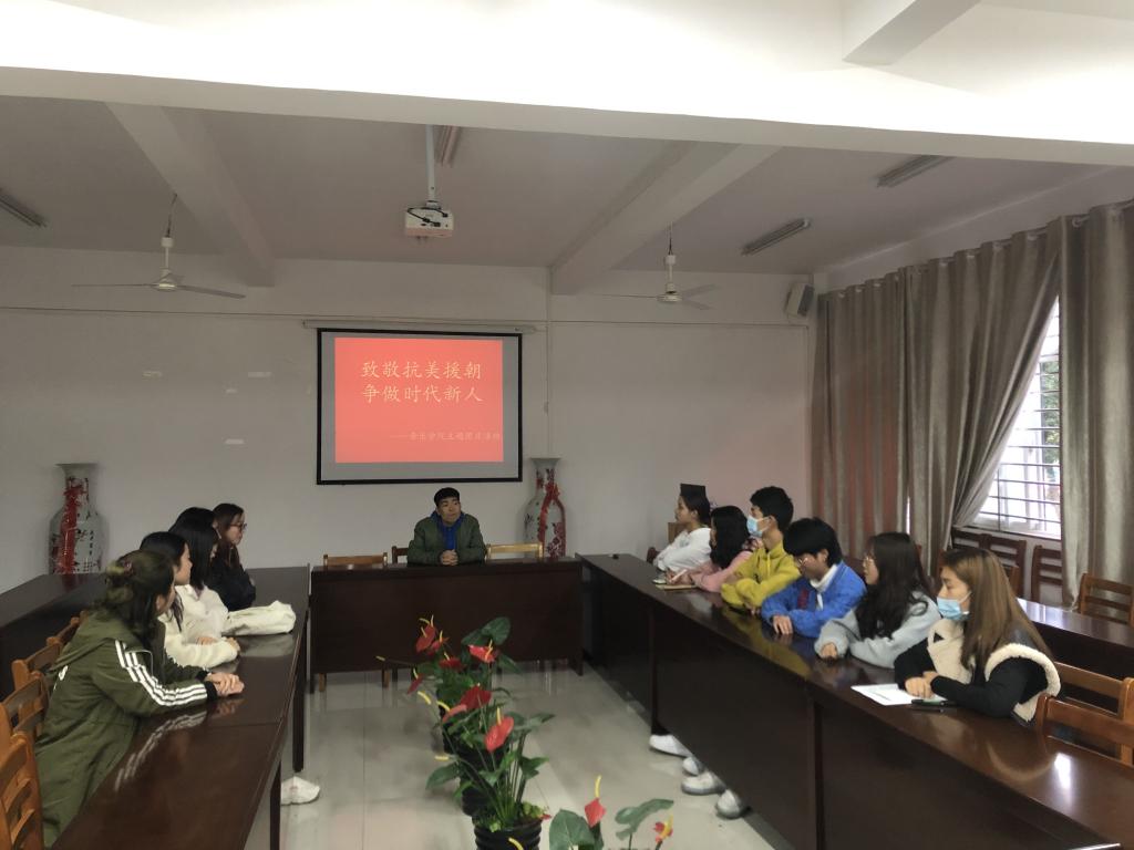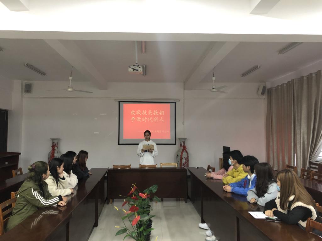 11月3日下午,太阳集团tyc138团员代表在艺术楼215以“致敬抗美援朝 争做时代新人”为主题,结合个人学习、实践经历,进行了精彩的演讲,大力弘扬伟大的抗美援朝精神和民族精神,集中展现青春奋进新时代、筑梦理想新征程的爱国之情。团总支书记裴奇向团员青年提出希望和要求,要继承和弘扬为了祖国和民族的尊严而奋不顾身的爱国主义精神;要继承和弘扬英勇顽强、舍生忘死的革命英雄主义精神;要继承和弘扬不畏艰难困苦的革命乐观主义精神;要继承和弘扬奉献一切的革命忠诚精神;继承和弘扬为了人类和平与正义事业而奋斗的国际主义精神。