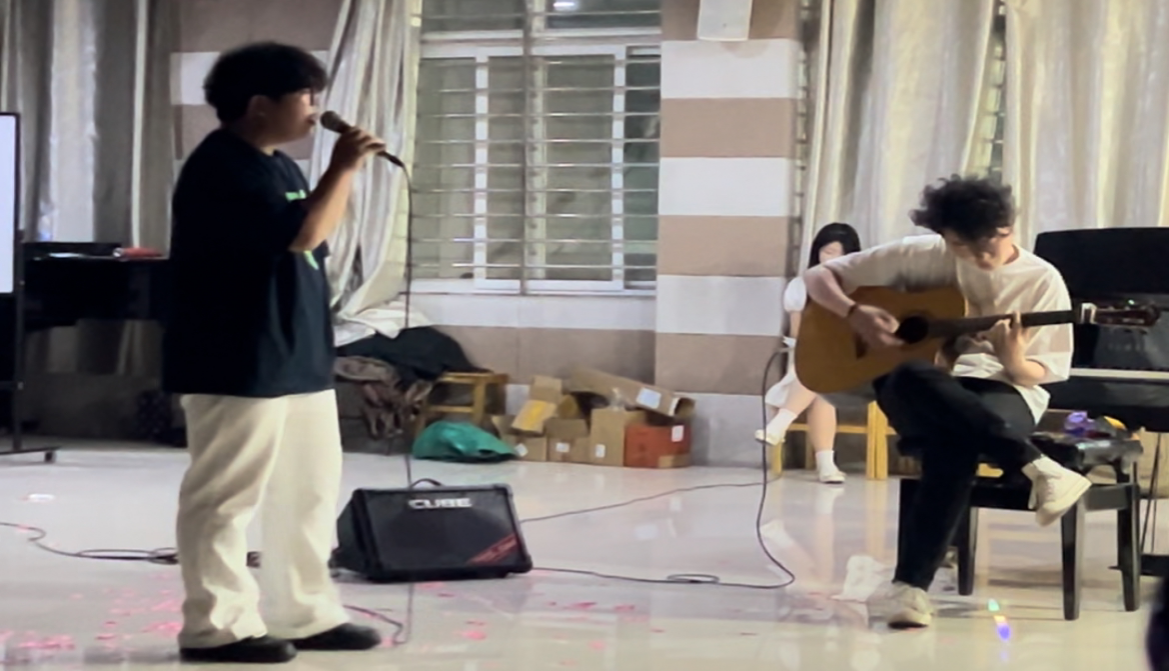 在主持人幽默风趣的介绍后,第一个出场的是我们的“吉他手”朱珈均和他的搭档安一嘉,两人配合默契,深情款款的为大家带来了一首《普通朋友》。