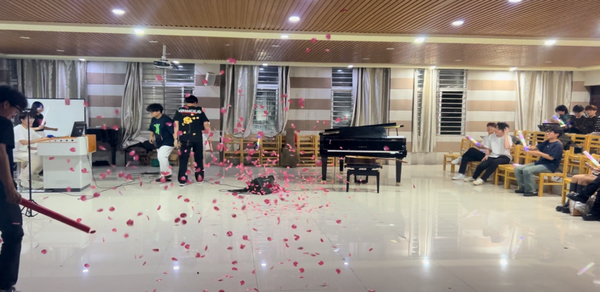 活动前由班级干部事先去场地进行布置,五彩斑斓的气球和琳琅满目的零食更为这次活动增添了不少热闹气氛。晚上七点半,伴随着漫天纷飞的花瓣礼炮,班级小舞台正式拉开帷幕。