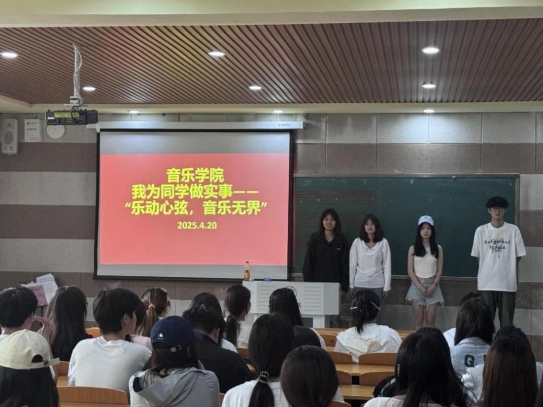 活动聚焦学生成长需求,通过创新服务形式,将音乐教育融入校园文化生活的点滴,为同学们打造多元化的成长成才的舞台,进一步践行“全心全意为同学服务”的宗旨。4月20日上午,在艺术楼202教室,学院开展“乐动心弦,音乐无界”—“我为同学做实事”系列活动,面向全校非音乐专业学生开设公益音乐课堂,开展基础乐理教学、简易乐器体验等。本次活动邀请了校园十佳歌手王岩,卢晴和陶思宜开展教学活动。