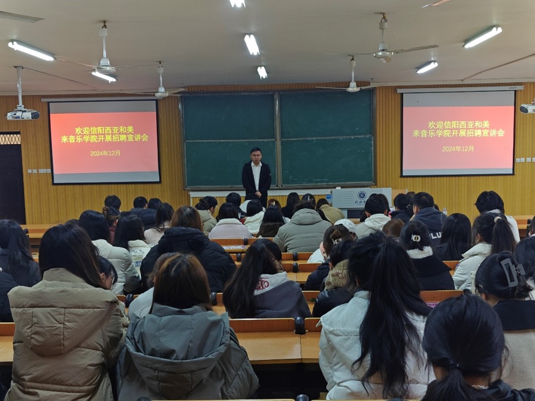 信阳西亚和美有限公司是一家从事百货、超市、家电、餐饮等业务的公司。马瑞就公司的现状、发展前景、招聘计划、薪资待遇等几个方面向同学们做了介绍。希望有意愿的学生可以积极投递简历,并在现场就相关的应聘细节和招聘方进行沟通。