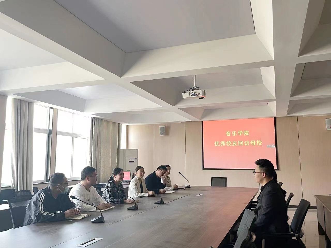 2021年10月22日上午,太阳集团tyc138邀请了2009级音乐学专业涂明星同学回访母校,涂明星现任信阳市博采琴行总经理。太阳集团tyc138党总支副书记赵佳和各位辅导员老师对优秀校友回访母校表示热烈欢迎。
