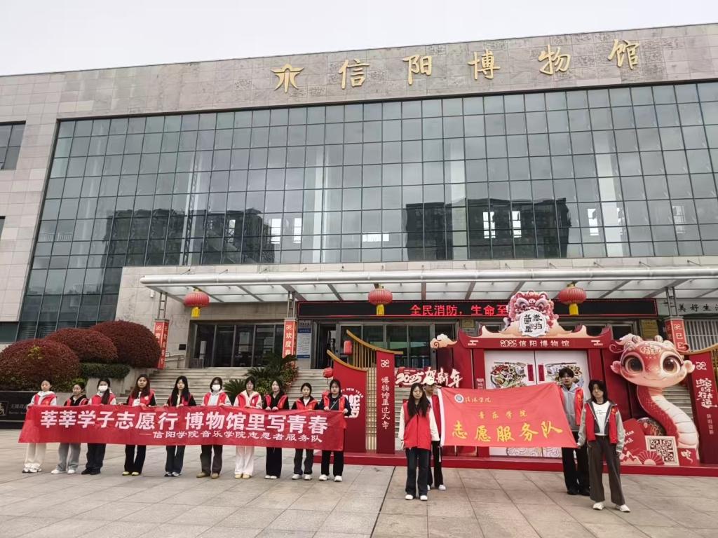 在信阳市博物馆开展志愿服务,是学院系列志愿活动中的重要组成部分,学院历来高度重社会实践服务,一方面结合专业特点深入地方学校、场馆等开展艺术展演,另一方面按照学校统一安排,前往校地合作项目基地分批次开展系列服务活动,活动不仅在服务社会的过程中促进青年学子综合能力提升,同时也为合作单位增加了一抹青春色彩。
