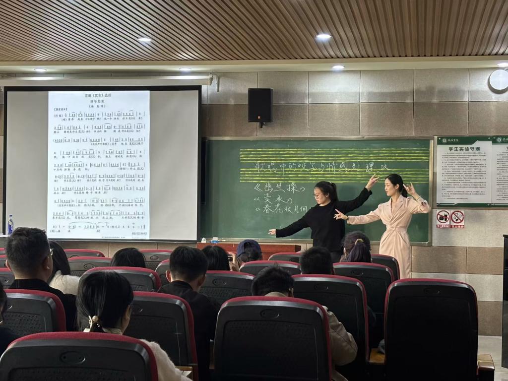 本次课程主要围绕“歌唱中的咬字和吐字与情感处理”展开。杨馥郁以歌唱中咬字吐字的理论和示范性教学为导入,精心选用中国古诗词艺术歌曲《幽兰操》《春花秋月何时了》和中国民族声乐《卖水》为例,讲授中国作品在歌唱中咬字和吐字的特点以及演唱技巧的处理方法,并带领学生们分析了歌唱时演唱技巧的运用和作品正确的情感表达,强调了钢琴伴奏在歌唱中的重要作用。杨馥郁还对歌曲内涵、情感张力、强弱处理表演等方面进行了具体而详细的示范讲解,并围绕京剧作品《卖水》进行了花旦表演的讲解,指导学生在演唱过程中做到唱做一体。公开课现场老师讲解热情细致,同学们听课专注认真,师生互动热烈,与会师生纷纷表示收获满满。