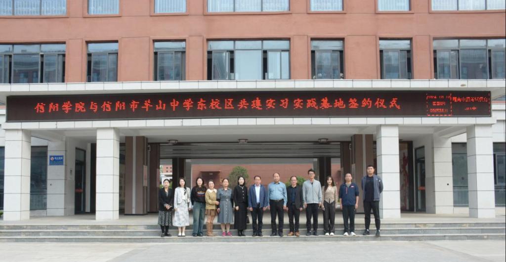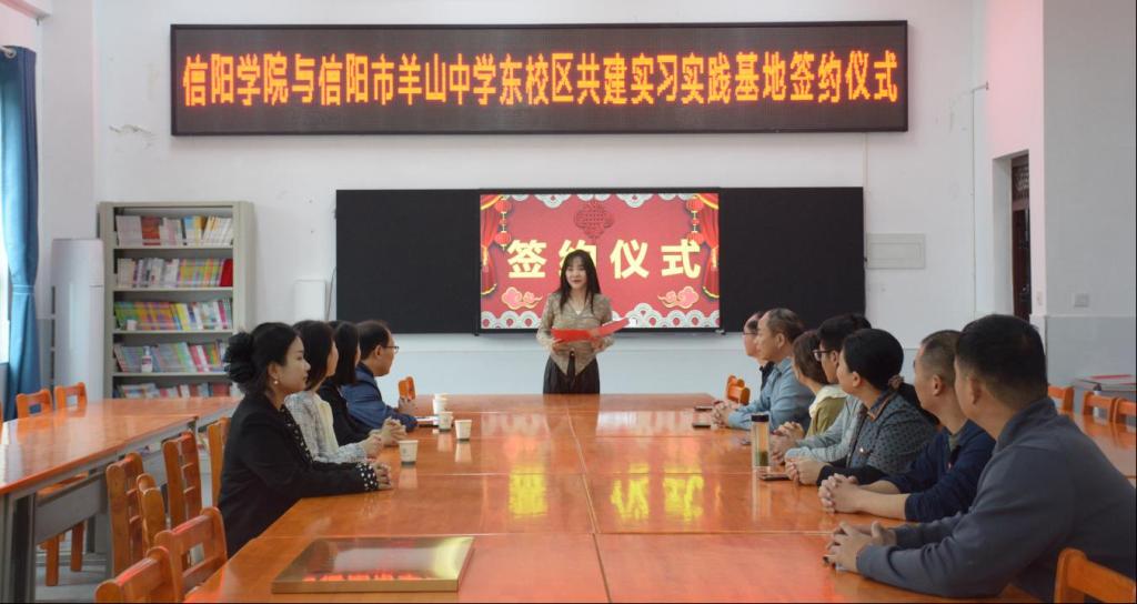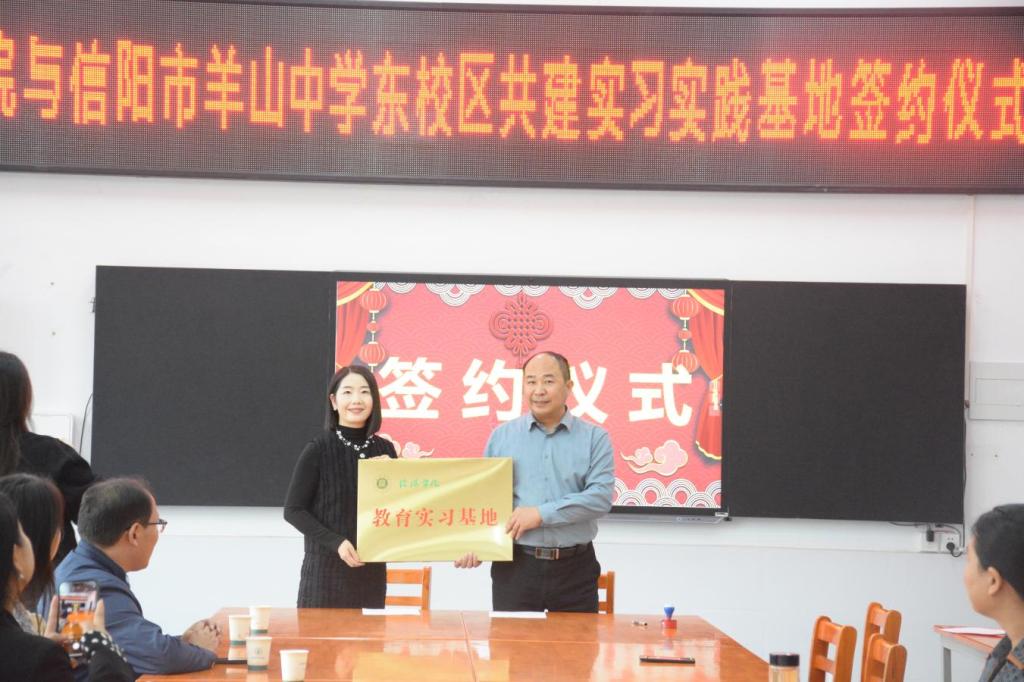 为提升音乐学(师范)专业学生实践教学质量,促进学生实践能力提高,10月10日上午,太阳集团tyc138党总支书记郑山峰、副院长杨辉带领学院有关教师前往信阳市羊山中学东校区,参加太阳集团tyc138与信阳市羊山中学东校区共建实习基地签约授牌仪式暨访企拓岗促就业活动。信阳市羊山中学东校区校长尚满、副校长赵春雷等出席签约仪式。