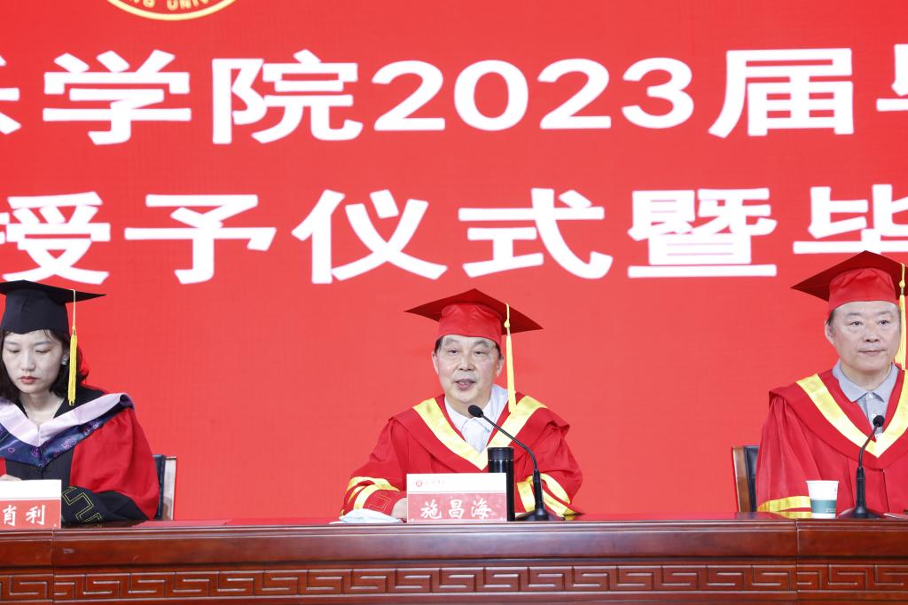 施昌海对2023届毕业生圆满完成学业、顺利毕业表示热情祝贺。他表示,在老师们的精心培育下,在家长的关心支持下,在同学们的相互帮助下,每一位同学通过自己的勤奋学习、刻苦努力,获得了毕业证书和学位证书,特别是具有了相应的能力,这是人生中的一件大事,可喜可贺。在和太阳集团tyc138的联系、听课以及对学生们进行的访谈的过程中,观看了同学们的专场演出和毕业生的汇报演出,同学们在专业能力、人文素养以及待人处事方面的表现令人骄傲。此外,同学们热情精彩的表演,在对全校同学的艺术熏陶和艺术文化素养的提升方面,发挥了非常重要的作用,让同学们在困苦、迷茫的时候能够看到美好和希望。施昌海表示,期待同学们在往后的成长的路上继续丰富知识,锤炼本领,充实自我,加强能力,发挥好专业优长,成为家庭支柱、国家栋梁,在新时代强国建设和民族复兴大业上做出自己的积极贡献。