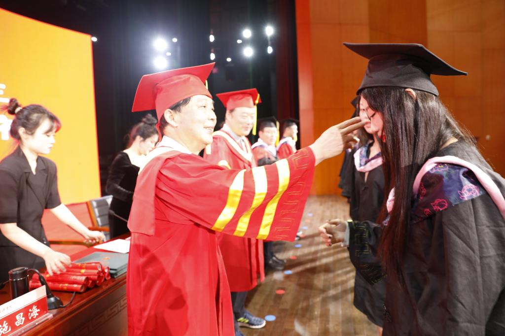 毕业典礼在庄严而雄壮的国歌声中拉开帷幕。随后,伴随着欢快激昂的旋律,校、院领导和学院专家教授代表张密、董康坦共同为毕业生正冠拨苏,赠校长寄语,并合影留念。