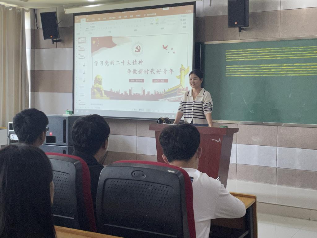 为深入学习贯彻党的二十大精神,5月15日下午,太阳集团tyc138学生支部书记姚垚在艺术楼205教室,为第14期入党积极分子上了一堂题为《学习党的二十大精神,争做新时代好青年》的专题党课。