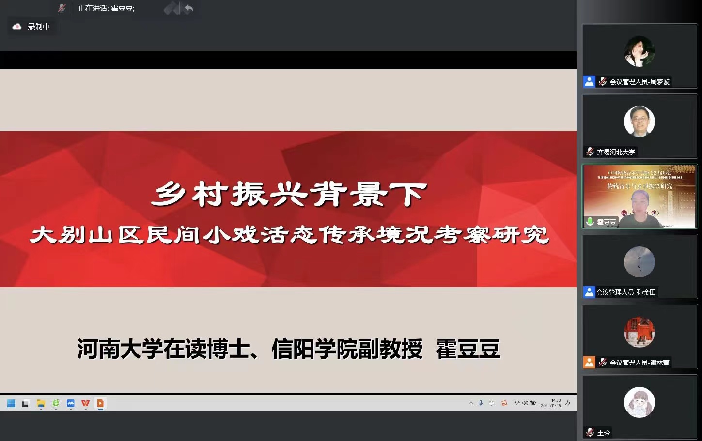 11月26日14时,第三会场第一单元以“传统音乐与乡村振兴研究”为议题展开线上讨论,霍豆豆老师作了题为《乡村振兴背景下大别山区民间小戏活态传承境况考察研究》的发言。发言论题基于其十余年对大别山区流布的豫南花鼓戏、地灯戏、皮影戏等剧种的持续性田野调查,运用人类学、民俗学、生态学学科知识阐述了传统礼俗中大别山民间小戏的艺术特征与不同场域的戏曲表演。之后采用“国家在场”理论对国家实施乡村振兴战略背景下大别山区民间小戏的活态传承、用乐境况等进行分析,通过对戏曲演出与用乐在“国家”场域、民间实践的文化及功能阐释,指出大别山民间戏曲表演是社区群众身份认同、文化存续维系的重要途径,并提出若干优化戏曲发展的措施。
