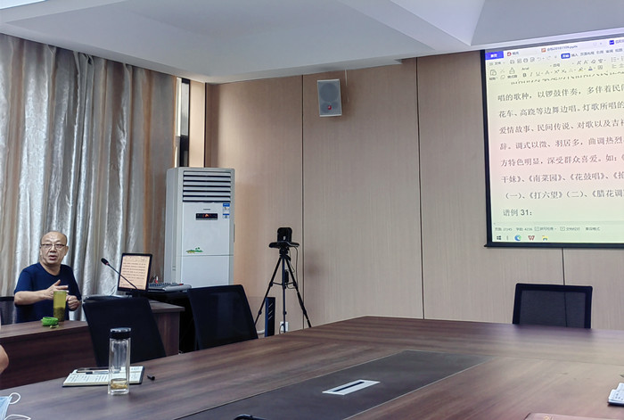 刘宏奎首先从历史的角度解读了信阳民歌的发展、传承、现状及影响,然后从信阳民歌的分布状况,信阳民歌的分类,信阳民歌的风格等方面进行了详细、幽默、通俗的讲解,最后结合他创作的《唱支茶歌迎客来》《拉网歌》以及他本人现场带有浓郁的乡土气息的演唱,把讲座气氛推向了高潮,不仅让老师们对信阳民歌有了更加深入的了解,也深刻感受到信阳优秀传统文化的魅力。讲座结束后,刘宏奎主席又对我院的信阳民歌贤山演唱团的节目进行了现场指导。