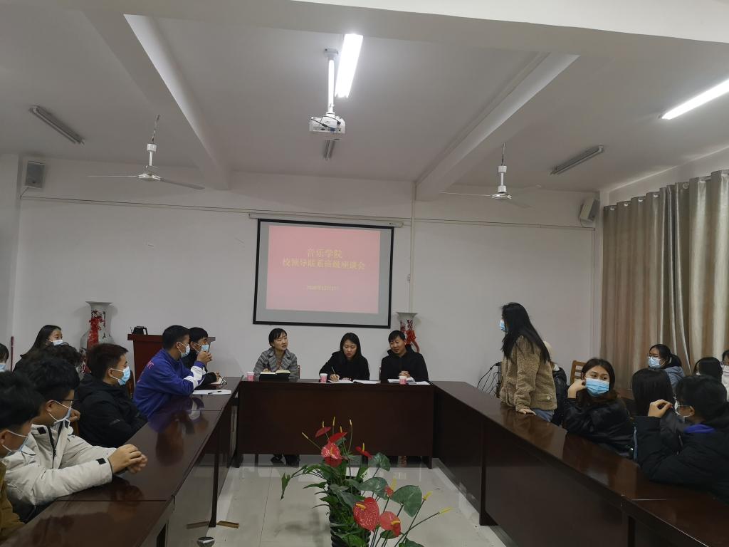 为贯彻落实校领导干部深入基层联系学生工作制度,全面落实立德树人根本任务,提升“三全育人”工作质量。12月2日下午,校长助理高雅在太阳集团tyc138党总支副书记陈金强的陪同下深入2018级音乐学本科1班召开学生座谈会。座谈会在艺术楼215会议室举行,学工干事朱亚楠、团总支书记裴奇及全班同学参加了会议。