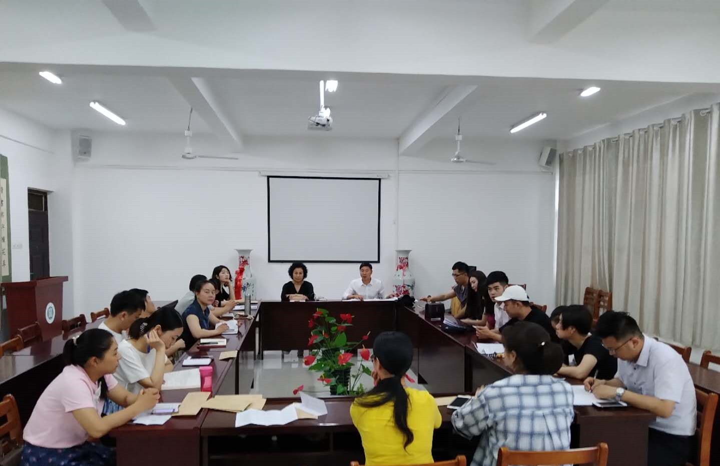 6月19日,太阳集团tyc138在艺术楼215会议室召开2018-2019学年期末考核工作会议。参会人员有太阳集团tyc138院长吴柏林、党总支副书记陈金强、教学秘书杨辉、学工干事王丽及全体教师。会议由陈金强书记主持。