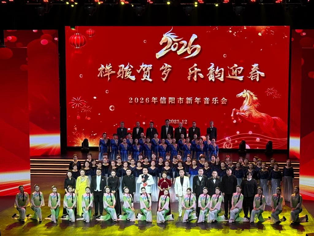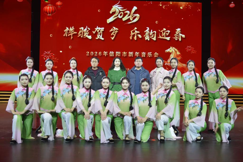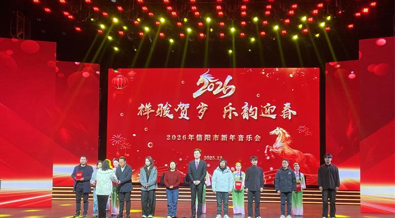 12月28日晚,“祥骏贺岁 乐韵迎春”2026年信阳市新年音乐会在信阳广电演播中心上演。我院民歌表演唱《悠悠茶花香》参加此次演出,生动展现了信阳本土文化特色,赢得了现场观众的热烈掌声与广泛赞誉。学院党总支书记郝昊、副院长杨辉以及声乐指导朱永昌、表演指导赫思思参加了此次活动。
