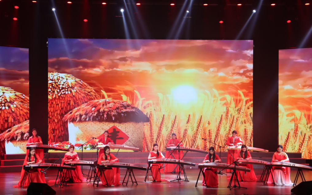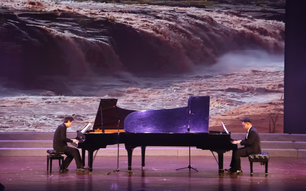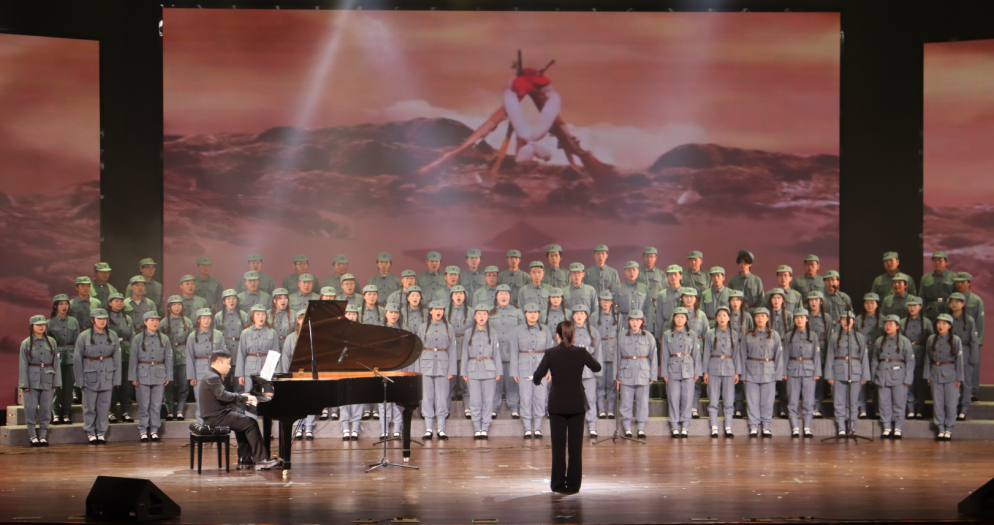 步入“铁血抗争铸脊梁”篇章,旋律陡然激昂:情景朗诵《这束光》以青年对话的形式,让不同时代的热血青春隔空共鸣,诠释出青年对引领民族前行的“希望之光”的思考与感悟;《在太行山上》《保卫黄河》的混声合唱气势如虹,钢琴协奏曲《黄河协奏曲・黄河愤》奏响抗争的强音,男声合唱《弹起我心爱的土琵琶》《游击队歌》则洋溢着乐观昂扬的战斗情怀,共同谱写了中国共产党领导下军民奋勇抗敌的英雄史诗;而《军民大生产》《纺线线》《南泥湾》的轻快节奏与古筝合奏《丰收锣鼓》的喜悦氛围,又将革命先辈自力更生、军民同心的奋斗场景娓娓道来。